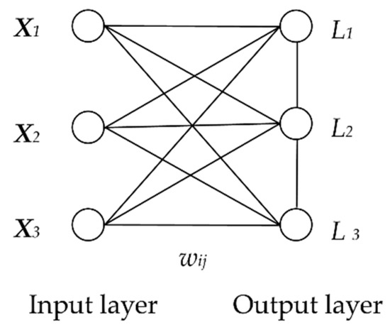Self-organized Feature Maps (SOM) was proposed by Kohonen [28], and is known as a Kohonen neural network (KNN). KNN is an unsupervised learning model for cluster analysis. Figure 10 shows the usual structure of KNN [29]. It has two layers, the input layer and the output layer. The number of neurons in the input layer is determined by the input vector dimension. The neurons of the output layer are placed on a two-dimensional matrix. There are weights between the neurons in the input layer and the neurons in the output layer. There are also weights on the output layers between the output neurons. For this paper, a one-dimensional KNN was used, whose structure is shown in Figure 11. There were three neurons (X1, X2 and X3) in the input layer, standing for the input data of displacement, settlement, and inclination. Damage to the spur dike in the flume experiment was classified into three levels (L1, L2 and L3), so three neurons were set in the output layer.