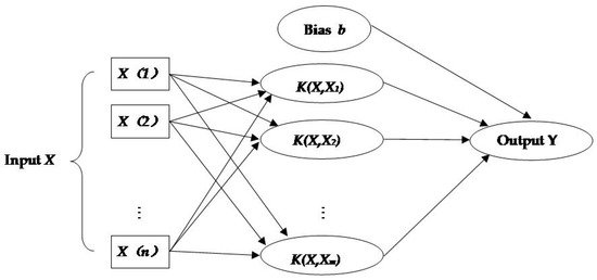 Support vector machine (SVM) is a frequently used data-driven model for prediction and classification. It was developed by Vapnik [32]. SVM is formulated based on the structure risk minimization principle. It has a great advantage in solving nonlinear problems with a small sample. SVM has been widely used in hydrological prediction [33,34] and anomaly detection [23,35]. Figure 12 shows the structure of support vector machine.