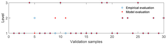 After the training process, the model was used to predict the damage levels of the validation sample. Figure 13 shows the comparison between the damage levels of the validation sample predicted by the model and evaluated according to the empirical criteria. Twenty-seven (27) samples were predicted correctly by the model, so the accuracy was 90%. This suggests that the support vector machine model can be an effective tool to predict the damage level of a spur dike. The damage levels of one data set predicted by the model were higher than the ones evaluated by the empirical criteria, and another two data sets were in the opposite situation. When the model is used for extrapolating the damage level of real spur dikes on the Yangtze River, the number of training data sets should be enough. No less than 50 sets of training data should be provided by the empirical criteria before the model training process.