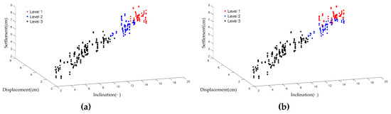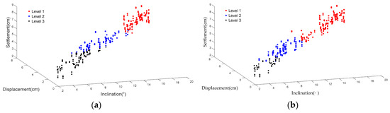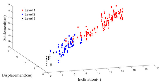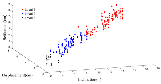 In most cases, measurement data are available but the classification criteria of the damage levels are unknown, so no training data are available to build the SVM prediction model. To solve this kind of problem, an unsupervised model was proposed by combining KNN and SVM. KNN is a data-mining algorithm that can classify data with a common feature through observing, analyzing, and comparing the data. In the KNN training process, the weights Wij are randomly initialized, so the winner neuron (damage level) might be different for the same data set in different simulation processes. Then, the SVM model was introduced to mitigate the problem of the unsteady output of the KNN model. To obtain a steady result, the predicted results of KNN were selected as the training data of the SVM model in combination with the corresponding measured data (inclination, displacement, settlement); then, a steady damage level evaluation result was given by SVM.