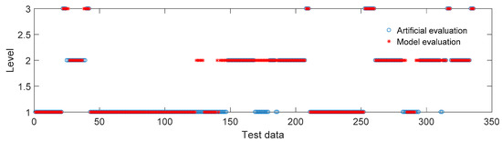 With regard to the classification pattern (I), the results of different training processes with the same model parameters were not exactly the same, as shown in Figure 14a,b, especially for the data sets near the critical values of damage between different damage levels. A stable output of damage level prediction is necessary in practical engineering, so the predicted damage levels of the KNN model together with the corresponding experiment data were input to the SVM model to conduct supervised training. To train the SVM model, 50 sets of the classification pattern (I) results together with the corresponding experiment data were used as the training data of the SVM model. After the learning process, the damage levels were classified by the SVM model and are shown in Figure 16. The damage levels classified according to the empirical criteria are shown in Figure 17. It can be seen from the comparison between Figure 16 and Figure 17 that most of the damage levels classified by the model and the empirical approach were the same. The data sets whose damage levels were evaluated differently by the model and the empirical approach lay in the critical range between different damage levels. This indicates that the classification criteria of the model were slightly different from the empirical classification criteria.