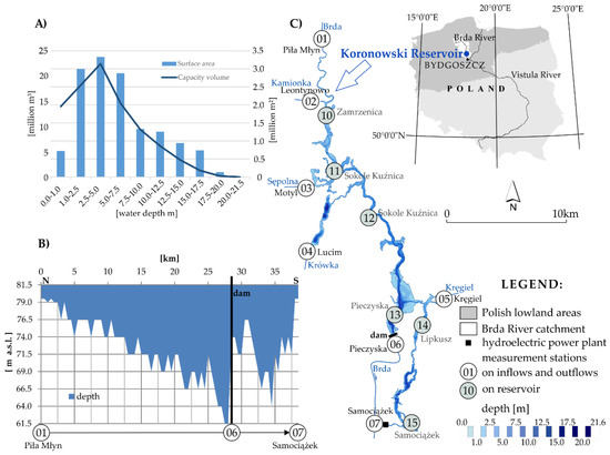 Location of measurement stations of suspended sediments of the Koronowski Reservoir catchment in the Polish lowlands [18,19]; 01–15 measurement stations (in grey on reservoir; in white on inflows and outflows), along with morphometric data: (A) Comparing surface area and capacity volume with depth; (B) longitudinal profile; and (C) bathymetry of the Koronowski Reservoir.
