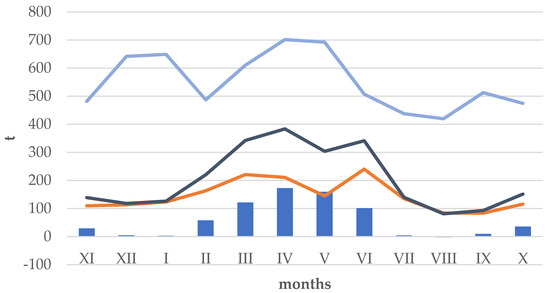 Total suspended sediment budget of Koronowski Reservoir during the hydrological year 2015. Explanations: inflowing suspended sediments (dark blue—2015; light blue—average 1980–2015 [47]); outflowing suspended sediments (orange) and suspended sediment balance (light blue columns).