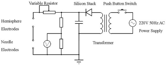 As shown in Figure 2, a transformer, silicon stack and capacitor are placed on a metal plate, which is connected to the ground. The transformer is also connected to a power supply. The push button switch on the power wire is not shown in Figure 2. The bar resistor crosses and connects the capacitor and the hemisphere. There are some wiretaps on the top of the bar resistor. By shorting out the taps, the resistance can be changed to 200 Ω, 300 Ω, 400 Ω, 500 Ω or 600 Ω. The resistor was designed to limit the currency in the circuit for safety. It can also be used to control the size of the cavitation bubble, especially when some operating liquids with low heat capacity (e.g., glycerol) are used. In our case, the resistance was maintained at 200 Ω to generate a relatively large cavitation bubble. The hemispheres are sealed in a glassy shell. The distance between the hemispheres is adjustable. The needle electrodes are under the hemispheres and in the water tank. They are tungsten needles, with a diameter of 1 mm.