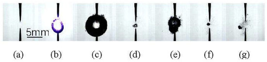 A spark-induced cavitation bubble at different stages, where the record rate is 100,000 fps, and the shutter speed is 8.39 μs. (a) t = 0 μs, a spark appears; (b) t = 100 μs, the plasma is glowing, and the cavitation bubble is exploding; (c) t = 500 μs, the cavitation bubble explodes at the maximum; (d) t = 950 μs, the cavitation bubble collapses at the minimum; (e) t = 1230 μs, the cavitation bubble rebounds at the maximum; (f) t = 1480 μs, the cavitation bubble collapses at the minimum again; (g) t = 2700 μs, the undissolved gas, after several explode–collapse cycles.