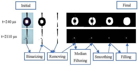 The first step is binarizing, namely, turning the photos into black and white, with a global threshold. The threshold is just the median of the grayscales of all the pixels. Alternatively, the threshold can be determined by the algorithm proposed by Bradley [33]. This algorithm calculates local adaptive thresholds, rather than a global one. After binarizing, a binary matrix is obtained, where 0 and 1 stand for black and white, respectively. The second step is taking an image, with only the needle electrodes as a template, and removing it from the image with both electrodes and the bubble. Then, a median filter, a smoothing filter and a filling algorithm are applied successively. Finally, the number of white pixels are counted, and the area is calculated with the area of a single pixel. All of the intermediate and final results of a large bubble and a small bubble are shown in Figure 5. The same algorithm and parameters were applied to the bubbles.