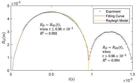 Note that the function is not continuous, and it breaks when the bubble collapses at the minimum. Thus, is a piecewise function. By fitting the experimental data, the factors at the local coordinates are obtained, as shown in Table 2.