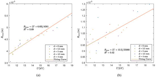 Relationship between breakdown voltage and the radius of cavitation bubbles. (a) The relationship between breakdown voltage and maximum radius of the cavitation bubbles; (b) the relationship between breakdown voltage and minimum radius of the cavitation bubbles.