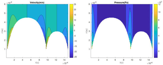 The calculated velocity field and pressure field are plotted as contour maps, as shown in Figure 8.