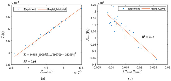 The maximum radius and the collapse time have an obvious linear correlation, where , as shown in Figure 9a. Moreover, the correlation between and can be calculated with the Rayleigh–Plesset equation, as follows: