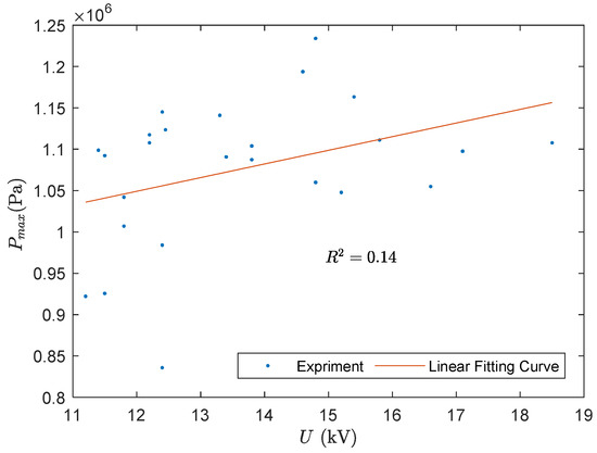 How the breakdown voltage affected the maximum pressure of the cavitation bubble was also investigated. As shown in Figure 10, the correlation is weak, as the dots are quite scattered. The main reason for this is that the maximum pressure depends on both the maximum and minimum radius. As mentioned in the last section, the minimum radius also has a poor correlation with the breakdown voltage. As a result, it is currently impossible to generate a certain impact pressure by adjusting the parameter of the instrument.