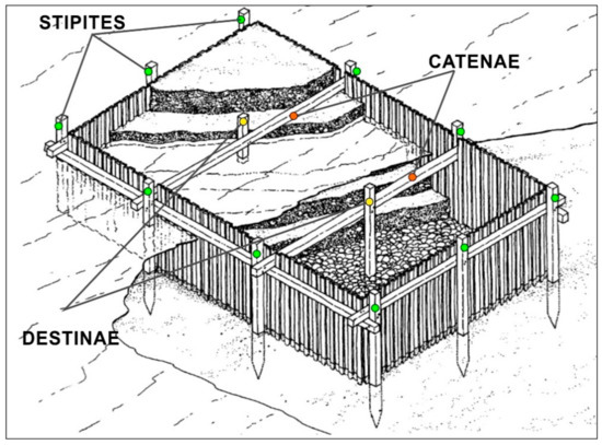 The pilae made in Roman concrete were grouped together in a single line (sometimes connected by arches, as at the breakwater at Nisida and Puteoli) or in two overlapping rows to form discontinuous breakwaters or sea defences for a shoreline or at the entrance to a harbour [39]. These cubic structures were built on the seabed with the cofferdam technique. Vitruvius precisely describes this technique in De Architectura (2.6.1, 5.12.2–3), but there are several useful shorter comments in Strabo, Pliny, and Dionysios of Halikarnassos [37,41]. The cofferdam sides were formed of oaken stakes (catenae and destinae, as shown in Figure 2), and filled up with hydraulic concrete.
