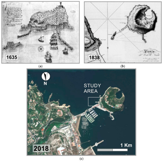 (a) Pictorial view of Nisida harbour in 1635 by B. Picchiatti where the Roman opus pilarum is clearly visible; (b) historical map “PIANTA DEL PORTO DI NISITA” 1838, where the pilae are still intact and emerged; and (c) present-day aerial photo.