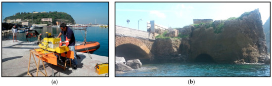 The Nisida Roman harbour was built in the first century BC—probably around 37 BC—when numerous maritime infrastructures were realised in the Gulf of Pozzuoli with the same building techniques [49]. It was located at the footslope of Nisida Island (Naples City), a tuff cone (3.9 ky BP [21]) partially dismantled by the waves, leaving a passage inside the crater and drawing a small bay (so-called Porto Paone) inhabited since the Roman period. This island, according to the tradition [50], was the otium residence of the Roman politician Marcus Iunius Brutus (85 BC–42 BC) and was connected with the land by a tunnel about 4.5 m high (Figure 3a,b), now partially submerged (Figure 3b). The Roman harbour of Nisida was characterised by an opus pilarum almost totally destroyed, except for three pilae making up the ancient pier nowadays submerged [51] (Figure 3a). Considering the remarkable size of the pilae (with edges up to 15 m) and the bathymetry in the area of about 10 m, the harbour probably represented a commercial hub for the suburban sector of Posillipo [49,52].