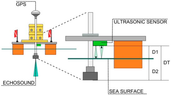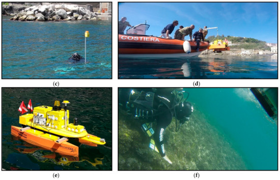 The coastal sector was mainly surveyed by remote sensing methods and the measurements were validated by direct surveys. A small USV was used during the marine surveys (Figure 4a,b,d,e), for both operational and technological reasons. The operative reason derives from the USV manoeuvrability, a characteristic necessary to carry out the planned survey with short and close navigation lines (lines spacing < 2 m) in a small area (15 m × 15 m). The technical reason derives from the equipment of the USV with photogrammetric and geophysical sensors.