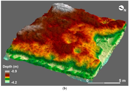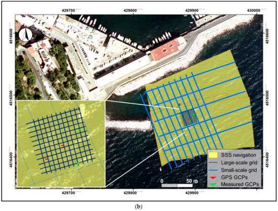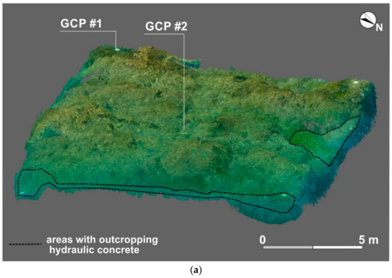 A team of scuba divers, archaeologist and geologists carried out the direct survey to validate the indirect measurements and to video-survey areas of archaeological interest to characterise the submerged structure. The GPS receiver was installed on a graduated range pole positioned on each GCP for a period of 10 min (Figure 4c) to collect single-frequency phase measurements.