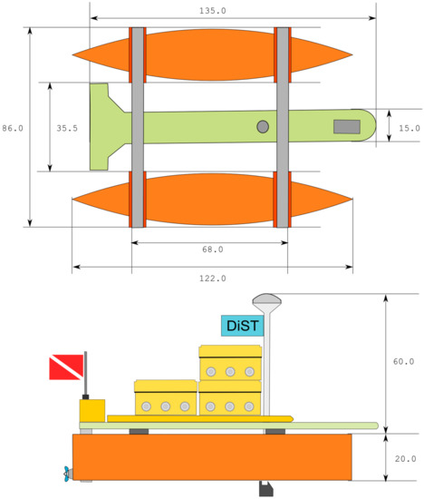 MicroVeGA platform is a catamaran-type vessel with an overall length of 135 cm, a width of 86 cm and a height of 80 cm (Figure 7, Table 1).