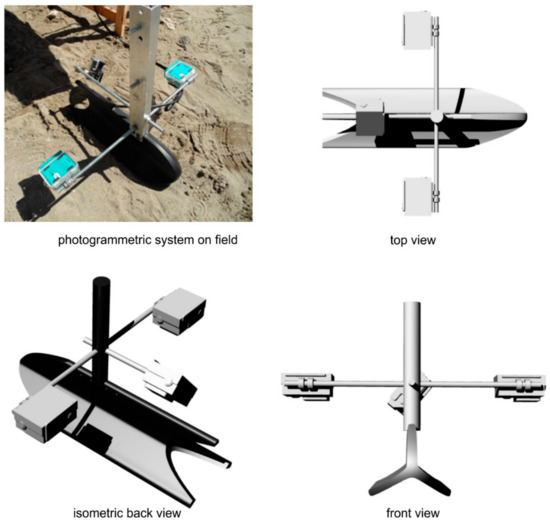 The photogrammetric system installed on-board of MicroVeGA consists of two Xiaomi YI Action cameras and a GoPro Hero 3. Two of them are placed parallel with the vertical axis, with a variable stereoscopic base (b) chosen in relation to the bathymetry of the study area. With our setting for the cameras, ensuring a minimum overlap of 80% during the survey. The third camera (GoPro Hero3) is placed with its axis that forms an angle of about 30° with the seabed. It acquires data from non-covered sectors (Figure 8 and Figure 9).