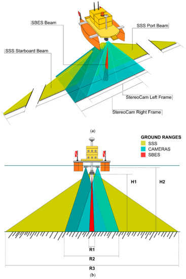 Sketches of ground ranges of acoustical and photogrammetric sensors (figure not in scale): (a) 3D reconstruction of the beam opening of the three sensors; and (b) 2D reconstruction of the beam opening of the three sensors. R1 is 0.139H1 (with an opening angle of the acoustic beam of 8°); R2 is 1.87H2 + b (where b is the stereoscopic base); and R3 can be set with the SSS software (Starfish Scanline V2.1) and varies between 4 and 300 m.