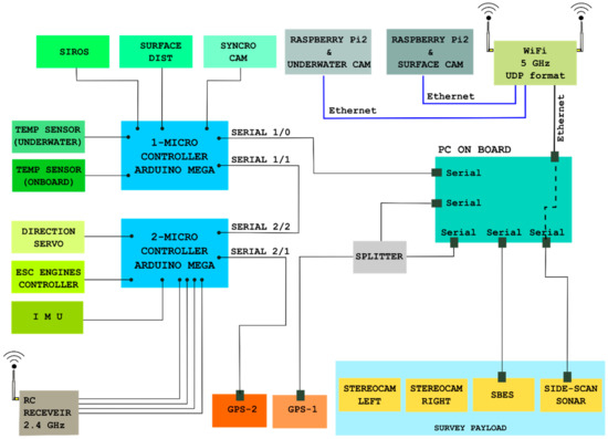 The core of the MicroVeGA USV is the platform management system (PMS, Figure 10), a customised framework of software applications (Microsoft VB, Linux, and C++) aimed at the full control of data and information flow. The PMS is based on a Mini IT low power single board computer VB7008 x86 with VIA C7-D 1.6 GHz processor, two Arduino MEGA 10-bit microcontrollers and two RaspBerry Pi2 micro-boards, connected via communication ports with the on-board systems (GPS, IMU, Gyro, side scan sonar, echosounder, obstacle detection sensors, temperature control sensors, engine and rudder management system, and survey cameras).