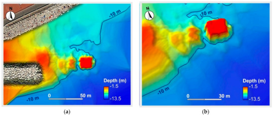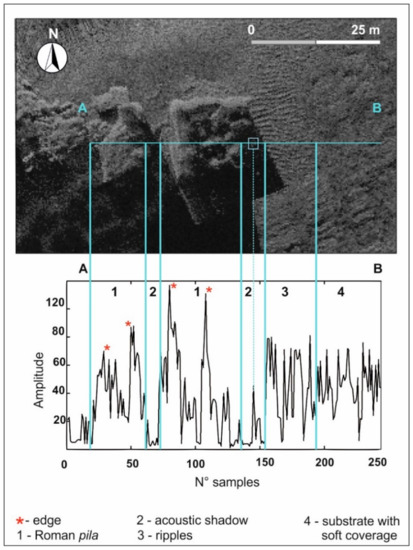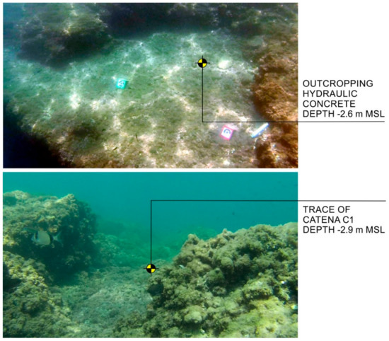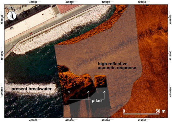 This seabed was acoustically characterised by means of the backscattering signal analysis as a tufa substrate covered by a thin sediments layer. This landform was interpreted as an ancient abrasion platform cut in Nisida yellow tuff [21] used as a base to build the pilae composing the pier. It can be supposed that the hard substrate was not modified in the last 2000 years and—as the direct survey demonstrated—the external pila of the opus pilarum that made up the pier is still in its original position. Furthermore, the seabed morphology and the pila position with its base at a present depth between 9 and 10 m b.s.l., as well as the steep slope immediately off the pier, endorse the hypothesis that the Nisida harbour was used for the landing of cargo ships (according to Gianfrotta et al. [52]).