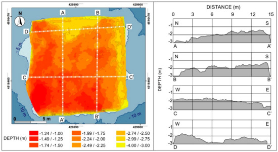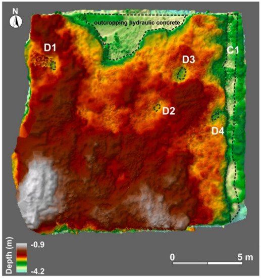 The large-scale analysis applied to the photogrammetric data allowed a precise evaluation of the pila conservation state as well as on its construction properties. Above all, it allowed to accurately measuring the palaeo- sea level during the Roman period. In fact, the morphometric analysis of the photogrammetric data led to the detection of the upper limit of the hydraulic concrete at a depth of 2.6 m b.s.l. By using this value as measuring point, the Roman sea level at −3.1 m at the time of the port construction can be deduced (Figure 20), endorsing the hypothesis that the Neapolitan coast was controlled by a subsiding trend in the last 2.0 ky [5,20,21,25,62].