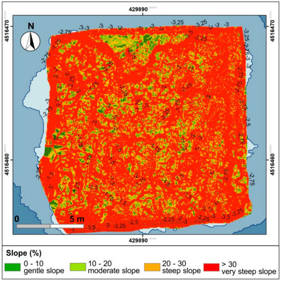 The study area extends for about 200 m parallel to the coast, and for about 150 m perpendicular to the coast. The bathymetry in this area ranges between the coastline and the isobath of −10 m.
