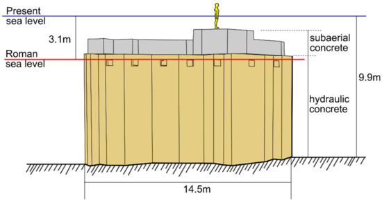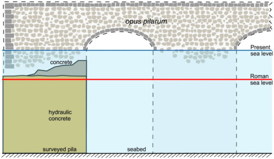The ancient piers and coastal defence structures during the Roman period—since the first century BC—were mainly composed of alignments of pilae—large or tall cubes. The pilae are a typical maritime construction evolved along with the development of hydraulic concrete in the Gulf of Naples [33,34,35,36]. The use of hydraulic concrete revolutionised the design of harbour and other maritime structures during this period and was well described by Strabo in Geographia, Vitruvius in De Architectura, Seneca in De Rerum Natura, and Plinius in Naturalis Historia.