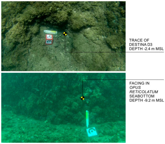 The vertical sides did not undergo significant erosive effects, preserving the facing in opus reticolatum up to the base of the structure at about 10 m b.s.l. In particular, the NW corner of the pila, the opus reticulatum is well preserved and clearly visible at the base due to the absence of algal vegetation. The cubilia composing the opus reticolatum are small cubes with sides of about 15 cm (Figure 23).