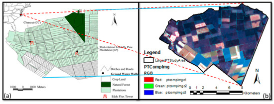 Study area location and instrumentations for climatologic data acquisition and hydrological monitoring—(a) Study area plot design and (b) False Color Composite (FCC) Landsat Image of the study area. Note: PTCompImg in Figure 1b = PT (larger) site Composite Image.