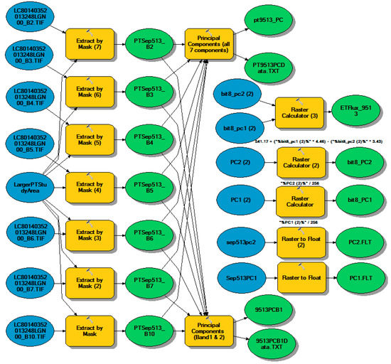 Figure 2 is a continuous workflow of developing the ET map of a single date for the study area using the principal component band images as discussed previously. The workflow is presented in the automated geospatial model developed in ArcGIS 10.3 ModelBuilder platform.