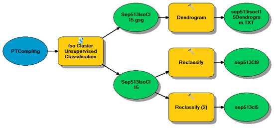 Initially, a visual comparison was conducted between our resultant ET Flux (Wm−2) map developed for 5 September 2013 (scan-line free Landsat 8 image) with the ET (mm/day) map of 20 July 2013 developed by Yang et al. (2016)’s team in the same study area of Parker Tract. The authors (Yang et al., 2016) [22] used cumbersome process-based high-end models like Atmospheric-Land Exchange Inverse (ALEXI) and disaggregation ALEXI (DisALEXI) that combine two-source energy balance (TSEB) and atmospheric boundary layer (ABL) models. The 2011 NLCD landuse classification map were two years apart from our ET map development date; as a result, researchers developed another automated geospatial model (Figure 3) in ArcGIS ModelBuilder platform using the unsupervised ISODATA clustering algorithm, WARD minimum variance statistical function based DENDROGRAM analysis, and reclassification of landuse types with the dendrogram result (Table 4) support to produce the landuse classification map of the same 5 September 2013 Landsat image (Figure 3). Initially, the ISODATA based 13 landuse classes merged together with dendrogram suggestion into 9 classes and later a five landuse class reclassified map was created with classes like (1) pine forest + mixed forest, (2) bare soil, (3) bare soil intermixed with sparse vegetation cover, (4) bare soil and vegetation intermix, and (5) agriculture.