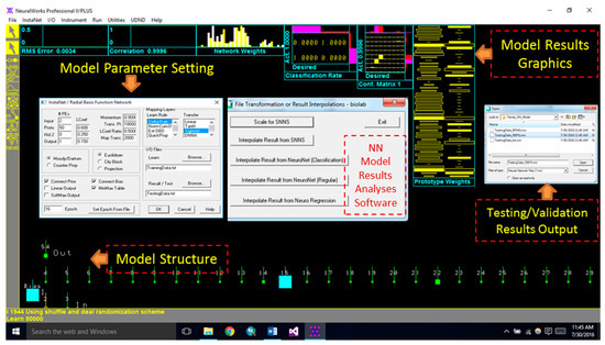 The same ‘Training’ and ‘Testing/Validation’ datasets used for the BPNN model development were also used in the RBFN modeling. The actual RBFN model architecture is provided in Figure 6. The model structure is presented in the bottom left corner of the figure showing two input parameters, one hidden layer, and one output parameter along with a bias factor associated with the hidden layer, or the processing unit of the model. The top of the figure shows the model graphics that was obtained after the model was run for training. The model parameters were set to the optimum following the neural network optimization step-by-step approach. The same (like in the BPNN model) learning coefficient of 0.5, momentum term of 0.9, and 45,000 epochs were found to be optimum for the RBFN model architecture, along with the learning rule of Delta-Rule algorithm and transfer function of sigmoid (Left-Middle of Figure 6). The training model RMSE error of very minimal 0.0034, data correlation of almost 100%, i.e., 0.99, and actual versus desired classification rate of almost 1.00 were obtained. It is shown at the top of Figure 6 visual along with the network weight variation dynamics and the confusion matrix. The RBFN trained model was used to validate the model using the prepared testing dataset. Our optimized model obtained average absolute prediction error of 0.15 (15% of the average actual normalized absolute ET flux values used as testing data) and an average accuracy of 84.8% (Appendix D).