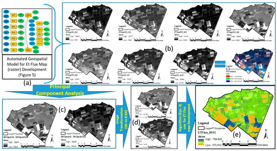 Resultant maps of the entire step-by-step process of the study to develop the automated geospatial model in ArcGIS ModelBuilder to develop the ET flux map of the study area using Landsat image rasters: (a) Automated geospatial model for ET Flux raster development using remote sensing data; (b) individual band raster of a selected composite Landsat 8 image; (c) 16-bit principal component 1 and 2 rasters obtained from the PCA analysis of the composite image; (d) 8-bit converted PC1 and 2 raster from Landsat 8 imagery 16-bit raster to compliment with 8-bit Landsat 7 ETM+ PC rasters; (e) Equation (8) based ET Flux raster of the study area.