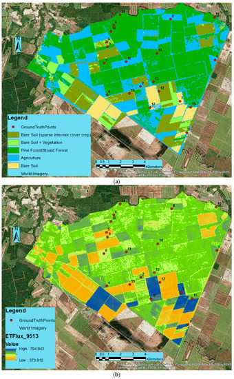 5 September 2013 false color composite (FCC) Landsat image was classified into five dominant landuse classes in the study area. Through randomly sampled 20 ground locations, we analyzed the landuse (Figure 8a) versus ET flux (Figure 8b) correlation trend to ascertain that the developed process of creating an ET flux map with Landsat images works properly (Figure 7e). Table 5 provides the correlational information about the landuse versus ET flux in the study area. Though, our study algorithm for ET flux estimation was developed for pine only still were able to estimate ET fluxes of other vegetation in the larger study area (Figure 7e). We found consistency between the landuse and ET flux values in the study area. The table (Table 5) is arranged with ET flux values from largest to smallest. From the analysis, it is clear that ‘bare soil’ land cover, which is actually the non-forested wetlands (As corroborated in Yang et al., 2016 [22] study), has the highest ET fluxes. Next higher ET flux is from the ‘agriculture’ landuse. Forest (pine forest/mixed forest) has moderate ET flux whereas obviously the upland ‘bare soil intermixed with sparse vegetation’ landuse has lowest ET flux values. In general, the ET patterns for different landuse types found in this study are similar to other studies reported in Yang et al. (2016) [22], Liu et al. (2010) [60]—Table 5 & Figure 4, and Wang et al. (2012) [61]—Figure 5.