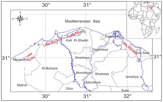 1. EGSA. Egyptian General Survey and Mining: Topographical Map cover Nile Delta, Scale 1:2 000 000; Egyptian General Survey and Mining (Publishing Center): Cairo, Egypt, 1997. [Google Scholar]