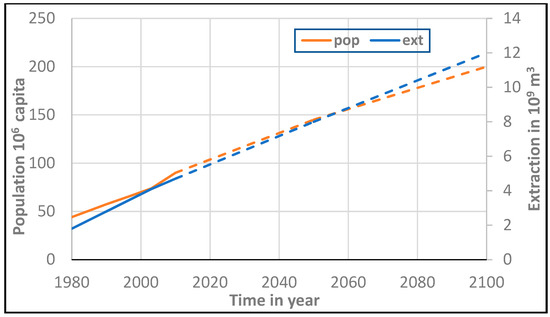 One of the most important factors that control the development scenarios is the population growth rate, as it represents the main condition that directly affects future economic and social progress. According to the Egyptian Central Authority for Public Mobilization and Statistics [25], the population in Egypt has risen by approximately from 52 million capita in 1990 to 84 million capita in 2010. The growth rate decreased from 2.75% per year in the period 1976–1986 to 2.02% per year during the period 1996–2006. The total population is predicted to reach 200 million capita in 2100 [26]. These population growth rates have led to corresponding increases in water needs for different water-consuming sectors. Moreover, in the future, the ascending gap between water demands and supply will result in more tension in negotiations over transboundary water projects on the Nile [27]. Groundwater extraction rates are likely to increase over time too, assuming the continuation of the almost linear trend of increase in groundwater extraction that follows population growth, as presented in Figure 2. This trend of increased groundwater extraction was constructed based on data collected from the past, starting in 1980 and then projecting until 2100 [4].