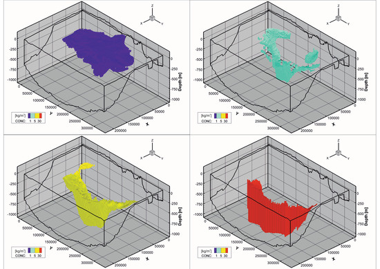 The total volume of groundwater in NDA up to the hydrogeological base was estimated to be approximately 4050 × 109 m3 covering an area of approximately 30 × 103 km2. This agrees with Reference [15] who estimated the groundwater volume of NDA to be around 3600 × 109 m3 but with a smaller modelled area (24 × 103 km2). According to [34], groundwater can be classified into different types with respect to the salinity level. Fresh water has a salinity of 0–1 kg/m3, light brackish has 1–5 kg/m3, brackish has 5–30 kg/m3 and saline water has salinity greater than 30 kg/m3. Figure 3 shows the different proportions of the groundwater types in 2010, together with their spatial distribution within the Delta. Fresh water accounts for 37%, light brackish 10%, brackish 21% and saline water 32%. The volume of total available fresh water is approximately 1290 × 109 m3 and the volume of light brackish water is about 421 × 109 m3. Table 2 provides estimates of the groundwater volume in ×109 m3 occupied by the four groundwater types for the current conditions in 2010 and for the six analysed scenarios.