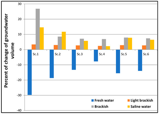 Under very optimistic conditions, Sc.4 (Restrictive) has a small saline groundwater volume increase (+2.2%). The fresh groundwater loss (–7.7%) is the lowest among all other scenarios. To achieve this, however, very rigid control of groundwater extraction is necessary. Alternative, unconventional sources of water are required, possibly in combination with water saving and planting of crops that are more resistant to salt. Figure 4 shows the percent of change in different scenarios for the analysed groundwater types with respect to the 2010 baseline values.