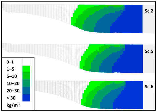 Figure 5 shows different cross-sections of the NDA for Scenarios 2, 5 and 6. It is clear that the salinity front advances the most in Sc.2 (extreme) followed by Sc.5 (high ext.) and Sc.6 (SLR). The scenarios have the same ordering with respect to the size of the dispersion zone.