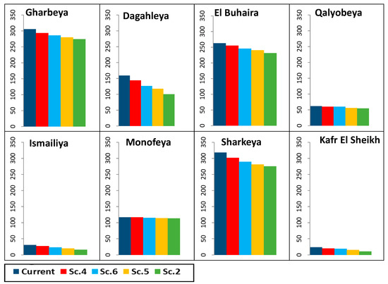 It is clear from Table 3 that El Buhaira, Gharbeya and Sharkeya have the highest freshwater volumes in all six scenarios (see Figure 1 for the locations of the governorates). On the other hand, coastal governorates have no fresh groundwater. Kafr El Sheikh and Ismailiya governorates have the lowest fresh groundwater volumes. The volume of fresh groundwater in each governorate is dependent on its location and distance from the coast, as well as the thickness of the aquifer, the governorate’s area, the reclamation projects and the number of groundwater extraction wells. Here, again, it is clear that Sc.2 (extreme) has the highest impact of the governorates on salinization in 2100, followed by Sc.5 (high ext.) and Sc.6 (high SLR).