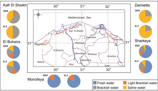 Figure 7 shows the distribution of different groundwater types for selected governorates in the current situation (2010) and in 2100 under Sc.2 (Extreme). The Monofeya governorate has no saline or brackish groundwater, while the coastal governorates, for example, Kafr El Sheikh and Damietta, contain mainly brackish and saline groundwater.