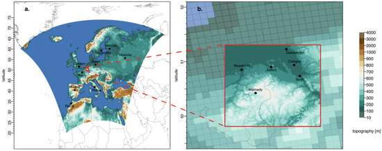 The monitoring domains, Europe (EU, left) and North Rhine-Westphalia (NRW, right). Black circles indicate capitals and major cities of the simulation domains. The domain highlighted in red in the figure on the right is the NRW domain, which is highly equipped with hydrological and hydrometeorological measurement equipment. The resolution differences in (b) illustrate the different grid cell sizes of the model setups, i.e., 12.5 km for the EU domain and 500 m for the NRW domain.