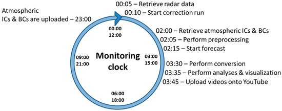 Figure 2 shows the monitoring clock, i.e., the timeline of the workflows for the NRW and EU domain (Section 3), that is executed automatically on a daily basis. Both workflows are the same, except for the precipitation radar correction, which is only applied for NRW, and the provision of the atmospheric initial and boundary condition information, which is provided from the DWD and ECMWF for NRW and EU, respectively. In case of NRW, the monitoring clock starts with the retrieval of the precipitation radar products of the University of Bonn shortly after midnight Universal Coordinated Time (UTC) followed by the correction run of the previous day. This run usually requires less than 1 h of compute time. DWD’s and ECMWF’s atmospheric initial and boundary conditions are made available around 02:00 UTC and preprocessing starts after the retrieval of the files from a FTP server. The actual monitoring runs with TSMP commence as soon as the initial and boundary conditions are preprocessed (around 02:15 UTC). The TSMP runs usually require between 1 and 1:30 h. In an ensuing step, post-processing is performed and forecasts are made publicly available via videos on YouTube around 03:45 UTC (see Section 3.1). The start of scripts is automatically postponed if required preceding steps are not completed or in case of missing initial and boundary information. The different steps of the monitoring clock are detailed in Section 3.