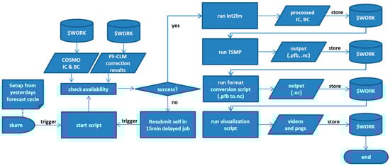 The cluster uses the CentOS 7 Linux distribution (https://www.centos.org) as operating system and handles the resource management with the slurm batch system and Parastation. Also relevant for this work is the fact that cronjobs (tasks scheduled in the background) are prohibited, ssh (secure shell) connections are secured by Rivest-Shamir-Adleman (RSA) key-pairs, and compute nodes do not have internet access. This is commonly the case in supercomputing environments, which are not designed and operated for operational use, and must be taken into account in the design of the workflow. The maximum wall-clock time is 24 hours and maintenance downtime affects the whole system for several hours on a regular basis (on demand 1–2 times per month).