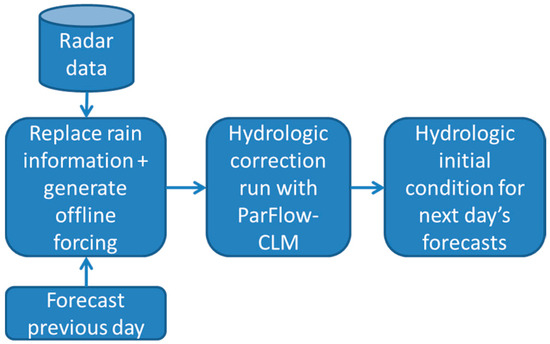 As mentioned above and in Section 2, the surface and subsurface models CLM and ParFlow are restarted utilizing the results/restart files of the previous day. This introduces errors due to inaccuracies in the prediction of water fluxes in the groundwater-to-atmosphere system, especially with regard to precipitation. In order to improve the hydrologic states, precipitation radar information is applied in a correction run in an extension of the workflow for NRW. Figure 4 shows the dependencies between the different tasks during the correction run. In a first step, the atmospheric simulation results from the previous day’s forecast are merged with the rain observations from the radar to generate an atmospheric forcing time series, which is used in an ensuing offline hydrologic simulation with CLM-ParFlow to arrive at the hydrologic initial condition for next day’s forecast (Figure 4).