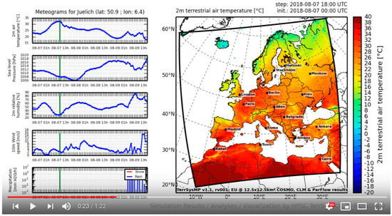 Monitoring output of TSMP (CORDEX EUR-11 domain) for the terrestrial 2 m air temperature (°C) at the peak of the heat wave on 7 August 2018. On the left from top to bottom, the meteograms depict 2 m air temperature (°C), sea level pressure (hPa), 10 m wind speed (m·s−1), and precipitation (mm·h−1) in Jülich (latitute: 50.9, longitude: 6.4), Germany.