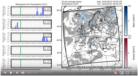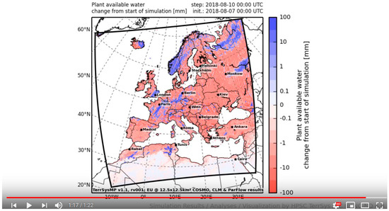 Figure 5 shows the 2-m air temperature forecasts over Europe on August 7th, which was the peak of the heat wave in Germany in 2018. Temperatures above 35 °C were recorded in Germany during that time period. In addition, meteograms are provided for the location of the city of Jülich, Germany, for 2-m air temperature, sea level barometric pressure, 2 m specific humidity, 20 m wind speed, and precipitation. Figure 6 shows the precipitation forecast over Europe including precipitation meteograms for a number of European capitals. Both figures constitute standard NWP-type products. Figure 7 shows the forecasted change in plant available soil water as a new product, which is the change in the amount of water that is available to plants via root water uptake at a matric potential > 10 m. The figure illustrates the overall recession of plant available water on the order of −10 mm over a period of 72 h with localized recharge due to local precipitation events toward the end of the forecast period.