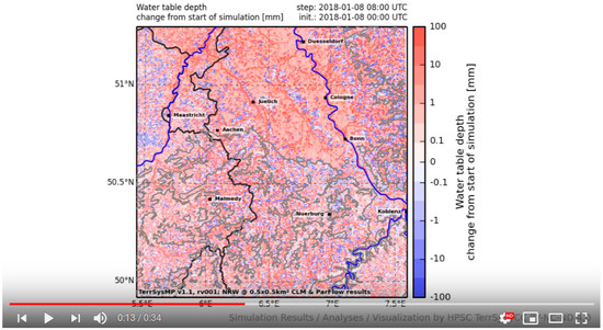 The component models of TSMP generate output files in different formats, ParFlow binary (PFB) and Network Common Data Format (netCDF), in hourly intervals. A NCL (NCAR command language) script converts PFB to netCDF and aggregates hourly model output files into one single file for additional post-processing and ensuing archiving. The analyses and visualization are done by a set of Python scripts, which read the output files generated by TSMP with the netCDF4 Python library in a first step. The output from, for example, ParFlow only consists of pressure and saturation for a given domain. Together with static fields, such as 2D and 3D fields of porosity, specific storage coefficients and slopes in x- and y-direction, the data is then post-processed to the desired analyses, such as surface runoff, groundwater recharge, plant available water, and groundwater table depth. Also standard meteorological products and analyses, such as wind speed, temperature, precipitation, and geopotential heights of pressure levels are generated. After the analysis of output variables is completed, frames for each individual analysis and time step (hourly) are plotted to PNG files with the Python libraries matplotlib and basemap. These PNG files are then rendered with FFmpeg into an AVI movie file.