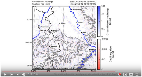 In comparison to widely available meteorological forecasts, the unique feature of the monitoring system are experimental analyses and monitoring products of all state variables and fluxes from groundwater across the land surface into the atmosphere. A large number of variables can be accessed at https://www.youtube.com/channel/UCGio3ckQwasR5a_kJo1GdOw. Below, some examples are shown for more classical atmospheric products (Figure 5 and Figure 6), a hydrologic variable (Figure 7) over Europe during the heat wave of 2018, and hydrologic variables over NRW (Figure 8 and Figure 9) during the flooding in January 2018, which are not commonly available. For example, Figure 9 shows groundwater recharge, which is a variable of great interest to public water managers and agriculture.